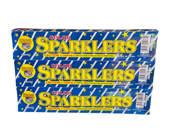 #8 Color Sparklers (12 Packs) – Great colored sparklers with a metal wire handle. Colors include red, green and gold.